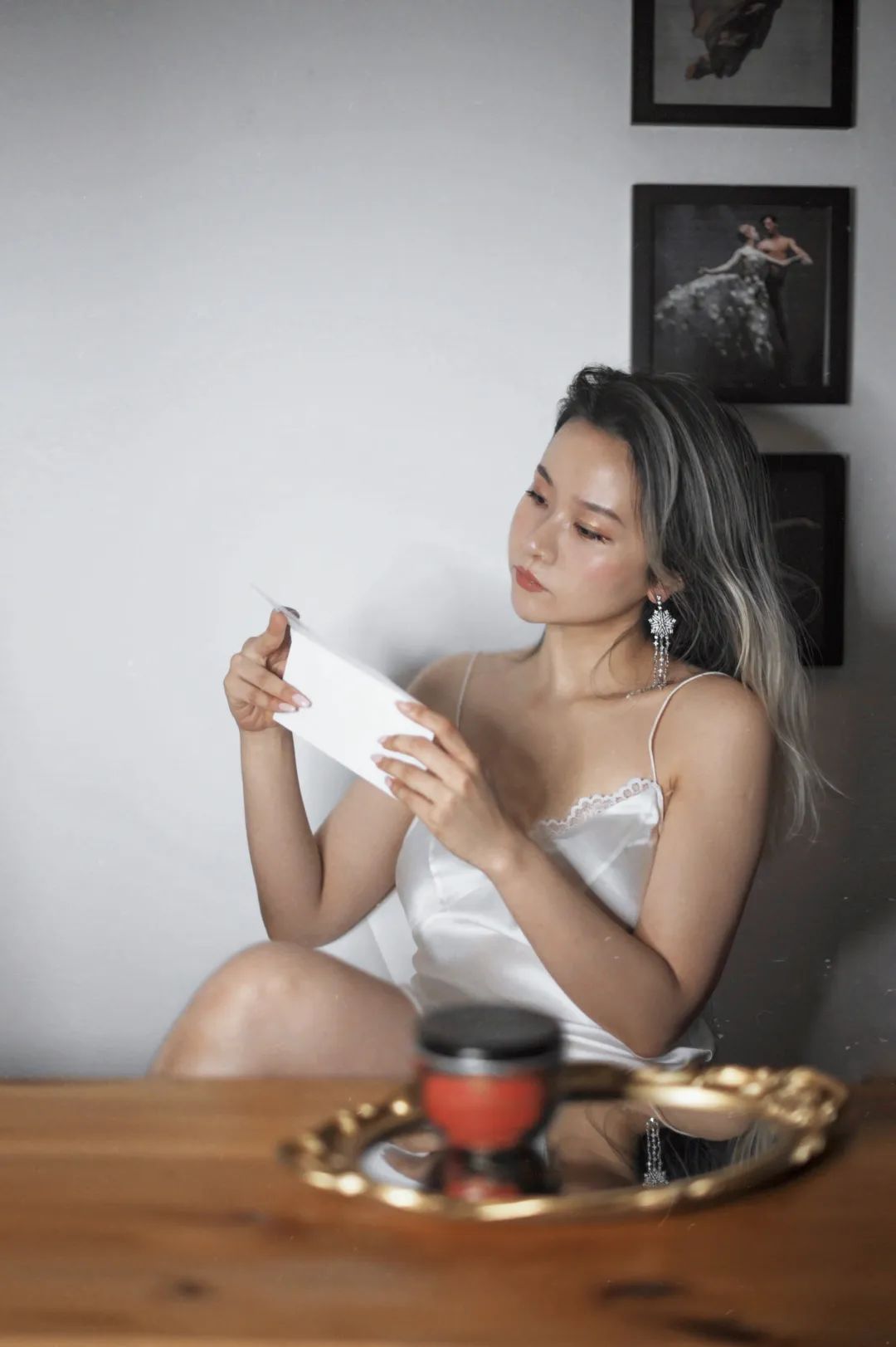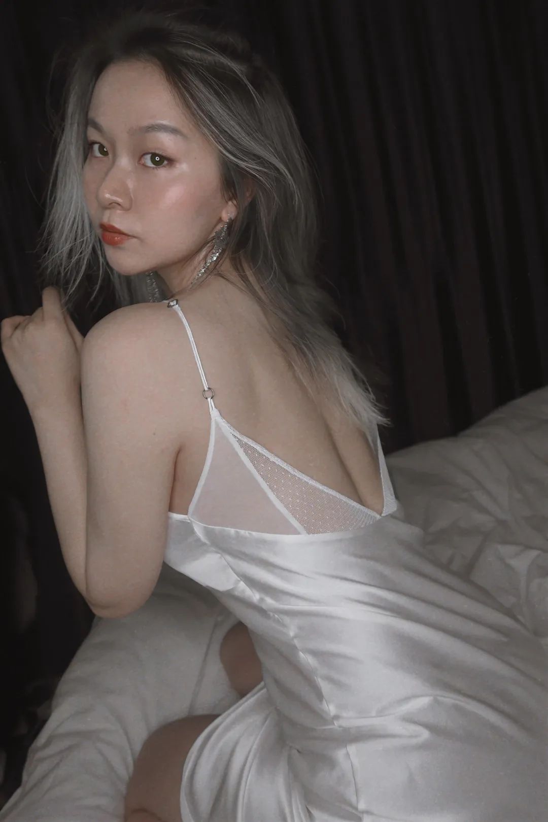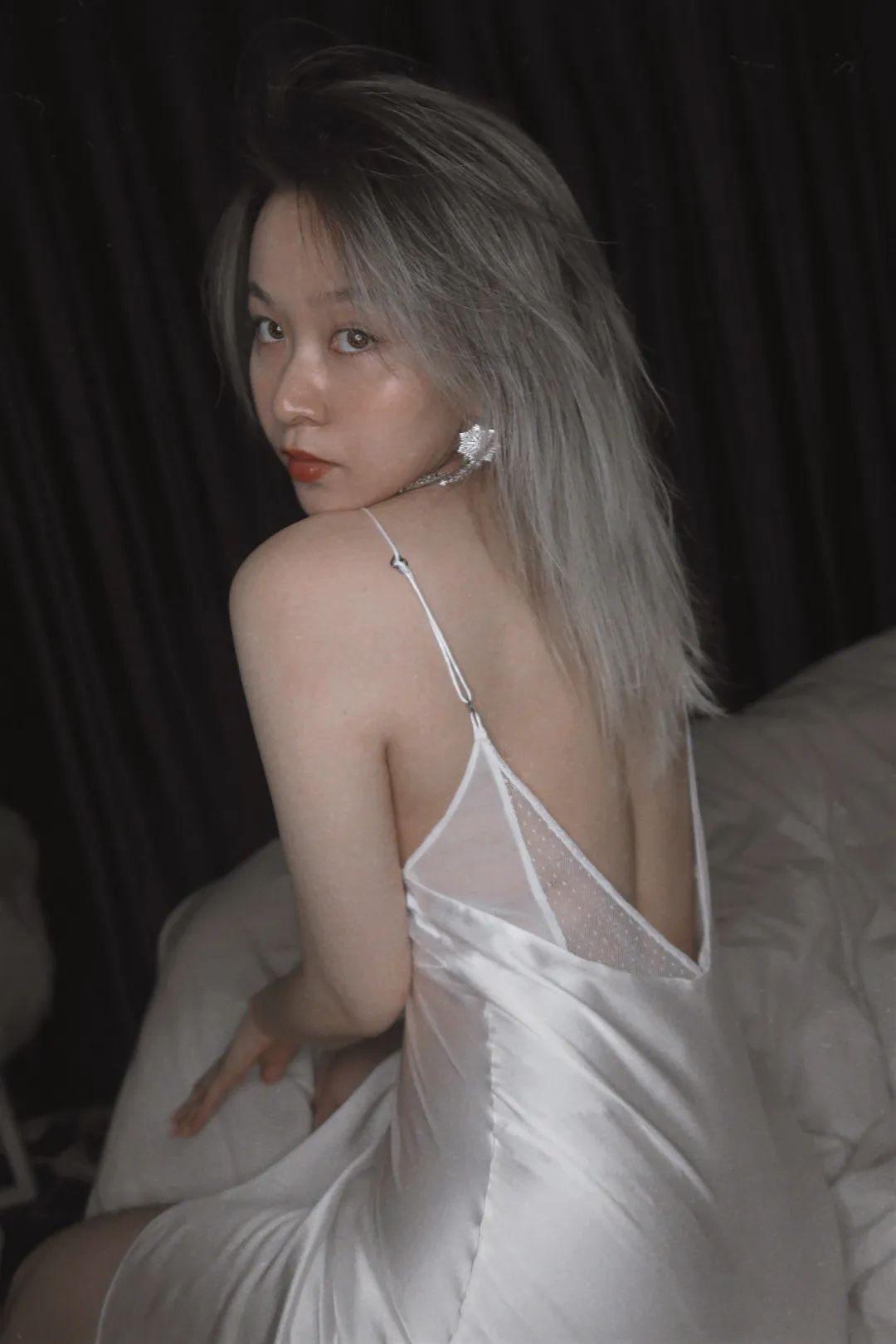 两条细细的肩带,勾勒出曼妙的露背空间。白色的网眼布进行装点,蝴蝶骨和脊线,是女人高级性感的另一面。
