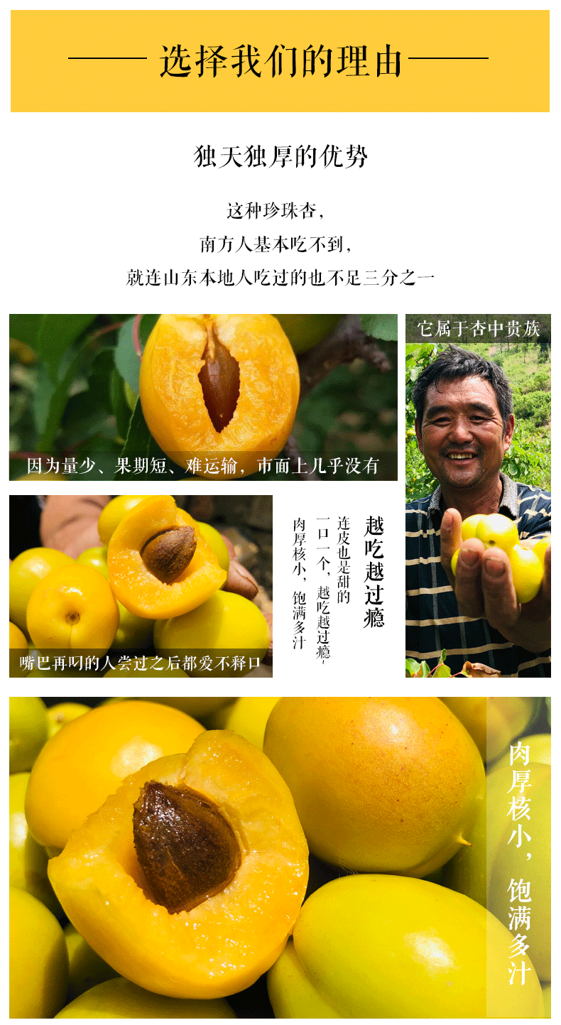 他们学问不多,但一直勤勤恳恳,只为让大家真正体验一次山东老家甜如蜜、醇香浓郁、农家肥种出来的珍珠杏!