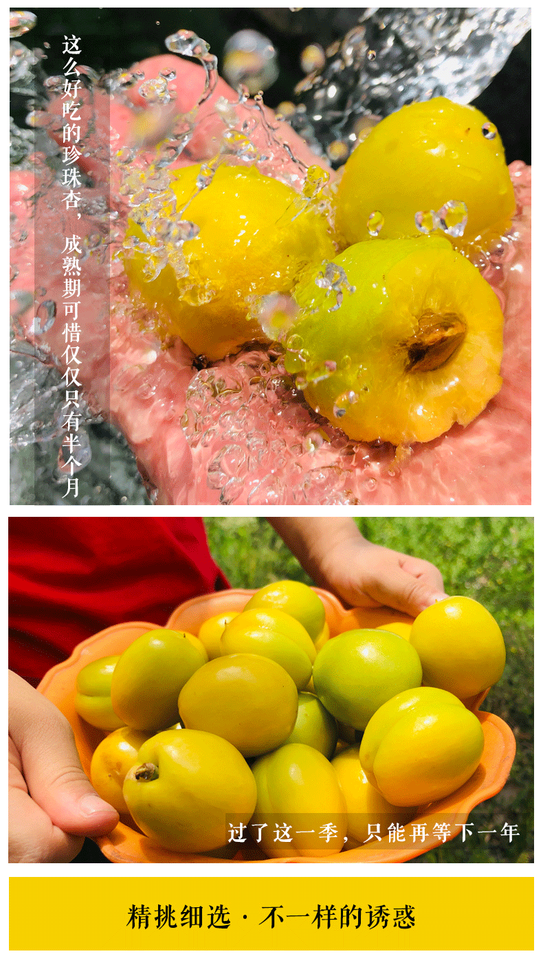 珍珠杏产量有限,且果期仅15天,每一颗都源自果农精挑细选。2斤包邮33.8元,超实惠的价格是新疆小白杏的一半,而味道绝对有过之无不及。