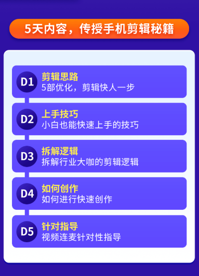 或许,你也注册过短视频平台账号。但你只用来刷短视频,或者零散的发了一些内容,距离变现还有一定距离。康乐老师刚开始做手机视频剪辑,也很害怕会失败,因为没人给她指路。她完全靠着自己摸索、试错,当时他特别希望有人能帮我一下,但是没有,因为大家都在摸黑前行。现在她成功了,也希望可以帮助到更多的人,让大家避免她曾经踩过的坑。其实成功是一道排除题,排除了错误项,其他的都是正确项。所以,康乐老师和讲真团队总结了《5天短视频变现训练营》,把她在手机剪辑这个领域的经验技巧总结出来告诉大家。通过这5天的学习,你会发现短视频原来很简单,1台手机,10分钟拍摄+剪辑+10秒上传,就能做到。康乐老师还会告诉你,怎么运营短视频更省力,因为他会给你可以直接套用的剪辑工具包和实操技巧,让你节省50%的精力。老师们多年累积的实战方法,以及帮助诸多学员的套路技巧,都会毫无保留分享给你,只要你愿意学!