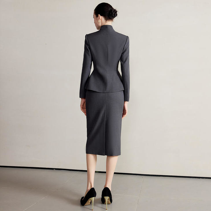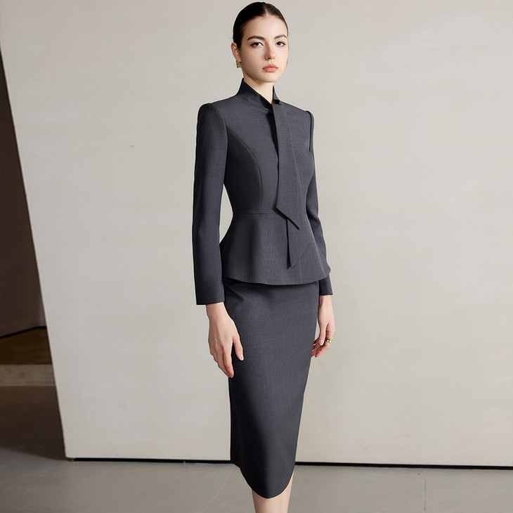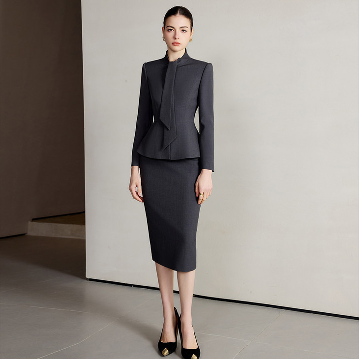 这套女装,堪称职场女性的“战袍”。深灰色西装外套,立领设计搭配别致的飘带元素,打破传统西装的刻板,在端庄中融入一丝灵动。修身的剪裁,贴合女性曲线,勾勒出自信身姿,让每一个职场步伐都气场十足。