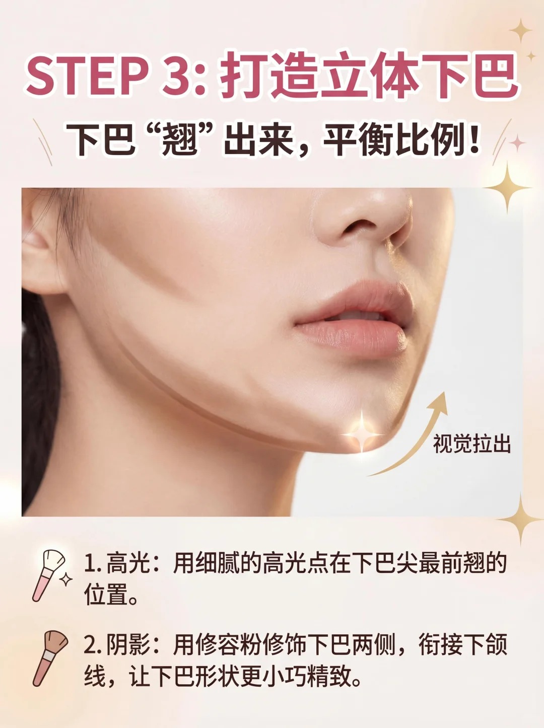 💡做法:用高光点在下巴最翘的点,增加立体感。再用修容粉从耳下沿着下颌线扫到下巴两侧,让下巴线条更清晰。这样一套组合拳下来,下巴就“翘”出来了!