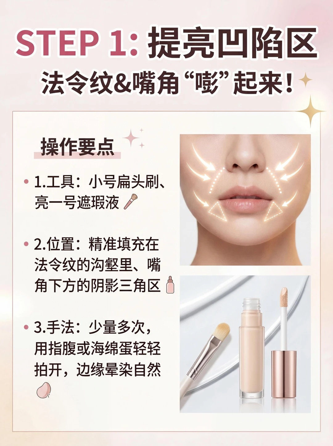 1️⃣ 提亮凹陷区:法令纹&嘴角“嘭”起来!