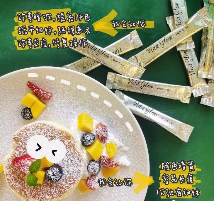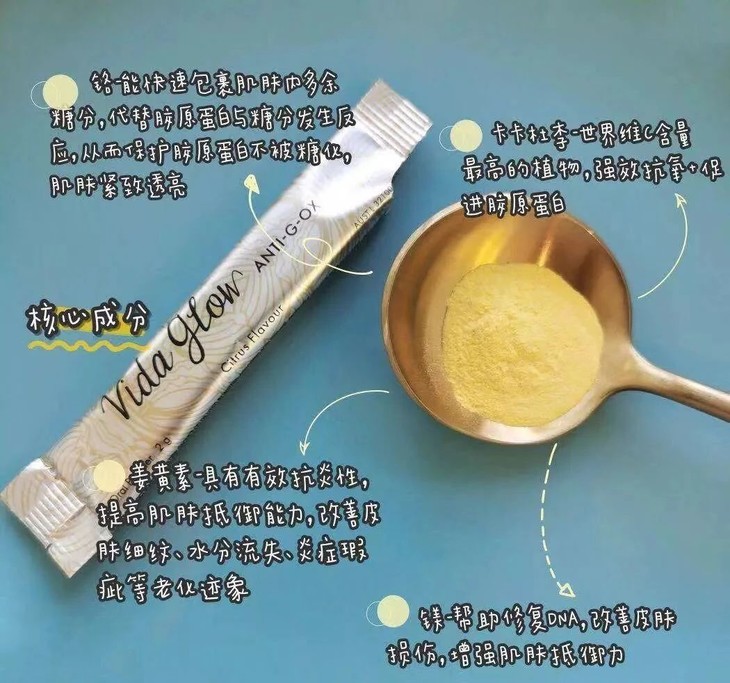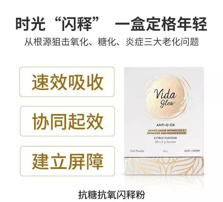 Vida Glow是澳洲备受关注的健康口服美容品牌,创始人Anna Lahey是澳洲知名营养学者。Vida Glow从创立至今,无时无刻不关注着,现代女性身体内在及外在的健康,5年来陪伴着万千女性帮助她们重新找回美丽与自信。Vida Glow创办逾五年,产品采用天然健康、卓效的深海胶原蛋白与澳洲水解工艺相结合,是全球数亿品牌忠实用户的冻龄肌密。从根源狙击氧化、糖化、炎症等女性三大“宿敌”,轻松见证肌肤的蜕变,相比传统美容方式,Vida Glow抗氧闪释粉堪称是瓶瓶罐罐的集大成者。抗糖抗氧闪释粉是一款以泡腾概念为载体的产品,入口即化,完美诠释了“闪释”的来源,“粉末以闪电一般的速度融化在嘴里” ,并快速进入血液循环。与传统的需要先到达胃部,由胃液分解外壳的片剂/胶囊或口服液相比,闪释粉在到达胃部前已经可以完全溶解。而且在闪释粉与水或唾液接触时能释放二氧化碳,二氧化碳能让有效成分迅速渗透到血液循环中,帮助人体通过肠道内膜,更快、更有效、更完整地吸收产品中的成分。全新Vida Glow抗氧闪释粉,首创闪释形态的抗衰产品。凭借独特的粉质形态,一进嘴巴就开始被吸收,吸收率高达90%,无论在使用方式还是吸收性能上都远超同类产品,为阻绝衰老打下良好基础,食用一个月,便能看见自己前后判若两人的上好气色。复旦大学附属华山医院(国内顶级皮肤科)医生马英权威推荐。Vida Glow抗氧闪释粉,一款整合了最新前沿技术的美容口服新品。通过口中含服的形式便能实现最快速彻底的吸收,让抗糖、抗氧、抗炎的效果加倍,从而让肌肤得到蜕变,堪称迄今为止口服美容产品史上最具颠覆性的创新之一!