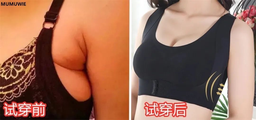 穿它之前,勒出的副乳非常明显,胸型很难看;穿上MUMUWIE内衣之后,副乳全部都被收拢,根本没有一丝的外溢,胸型更饱满!