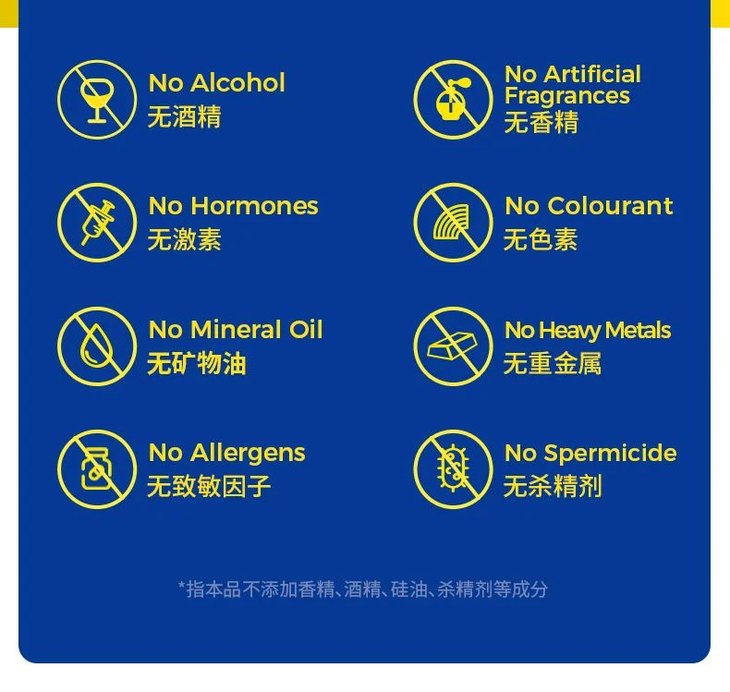 所有产品无酒精、无香精、无激素、无色素、无矿物油、无重金属、无杀精剂、无致敏因子。