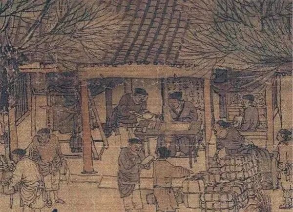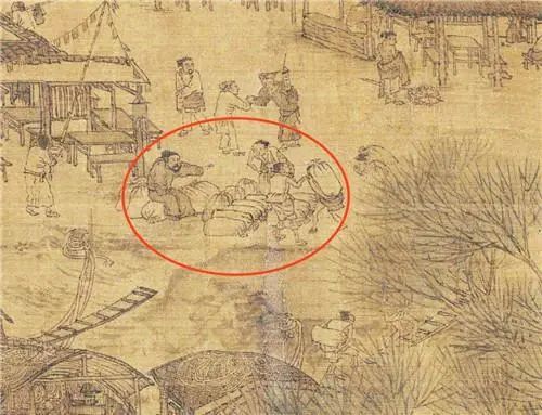 为了抵御灾荒和控制商贾的势力,北宋时期朝廷注重在汴河两岸建造粮仓。画中船主正指挥着装卸工人运载粮食到深巷的私人粮仓,所有的粮船在汴河上肆意运输,岸边连设督粮官看管都没有。朝廷储运粮食被民间的商贾压制,北宋潜在的官粮危机暴露无遗