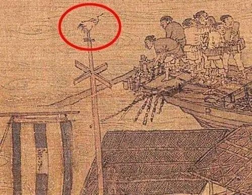 岸边立有一根木杆,木杆的顶部有一个形状像鸟一样的东西,这个东西叫做”五两”当然它北宋用来装饰美观的。何为“五两”呢,就是用五两的鸡毛所制成,放在木杆顶端,风刮过来,鸟头朝哪便可知道是哪个方向,这就是古代的测风仪,我们也不得不佩服先人的智慧。
