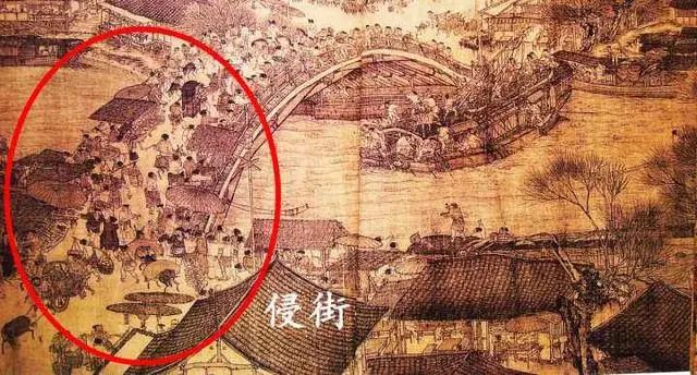 北宋社会“侵街现象十分的严重”画中街道上出现大量的固定摊位以及摊位上加建的遮阳棚和挡雨棚这样的辅助性建筑物。经过商贩们无数次的“得寸进尺”,终于构成了北宋几朝无法根治的“侵街”现象,造成交通拥挤,桥上拥堵,险象环生的局面,周围木制建筑较多,火灾频频发生。
