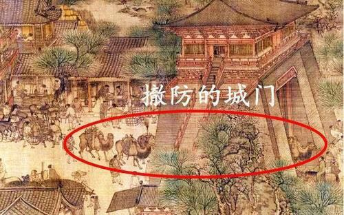 我们可以看到一队骆驼商队正在缓慢的穿过城门,城门身为一个国家的防线,本应该重兵把守却没有任何的守卫。北宋的大门如同虚设一般,虽然这样人来人往方便许多,北宋的百姓也安居乐业,他们大概不会想到金兵想伪装进来也是轻而易举的吧!北宋当朝的皇帝只管享受,是否想过想人会惦记你的城门呢。