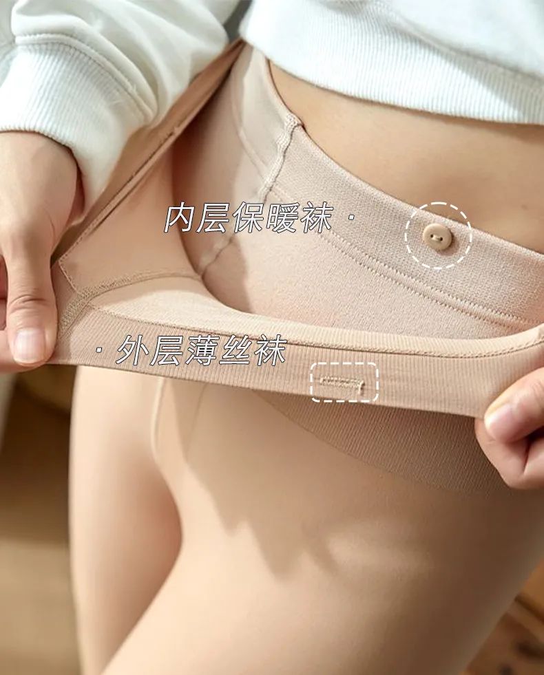 外层是薄丝袜,内层是保暖袜,腰部有纽扣连接,外层可替换,也可一条拆成两条穿,这设计实用又贴心!