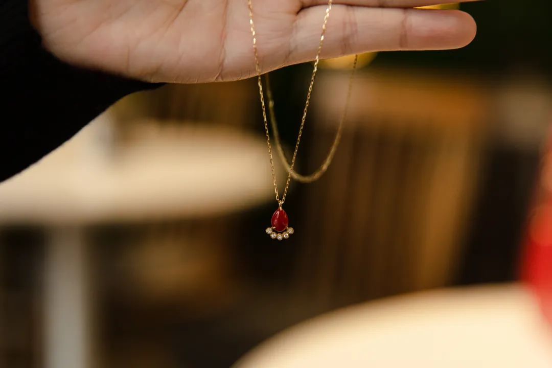 裙摆吊坠 阿卡红珊瑚 直径约5mm 5粒钻石镶嵌 18k金 链子40+5cm