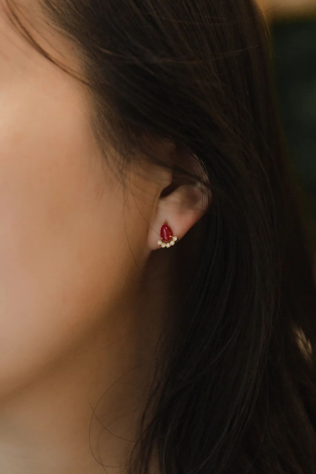 裙摆耳钉 阿卡红珊瑚 日本成品进口 直径约5mm 18k金10粒钻石镶嵌
