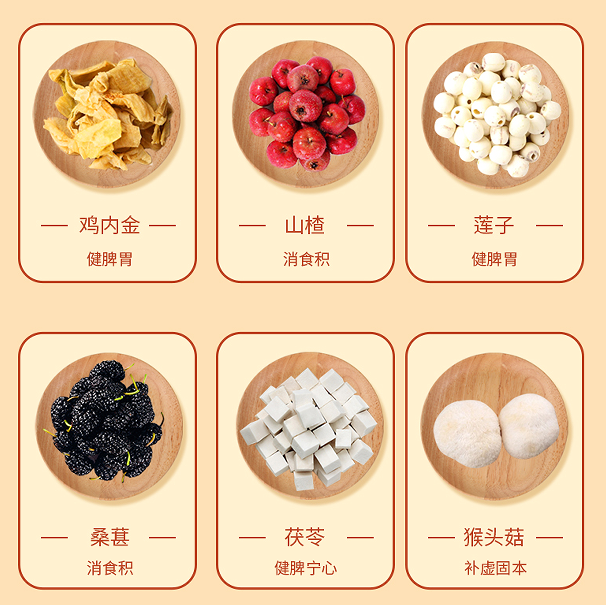 鸡内金、山楂、茯苓。莲子、桑葚,多重草本复合配方,一口下去,满满的食疗能量,健脾养胃~
