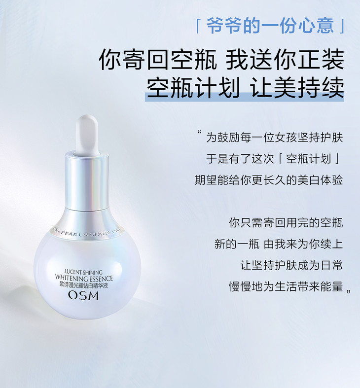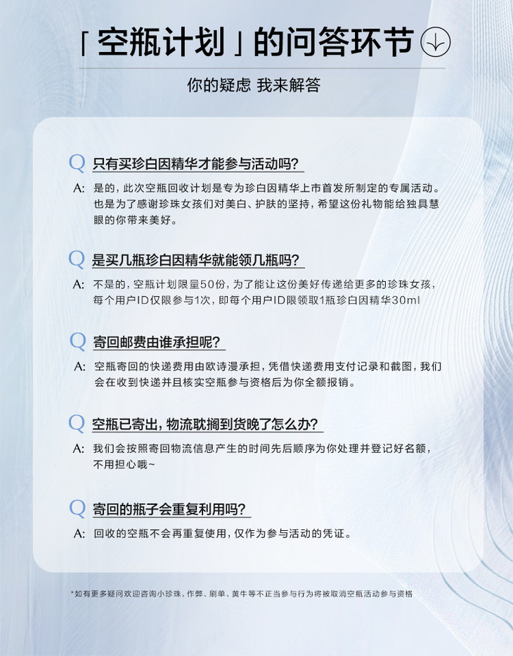上市首发期间(5月5日~5月10日)成功购买新品珍白因精华正装即可参与【珍白因精华空瓶计划】,6月30日前寄回空瓶即可再免费领取同款正装精华30ml一支!具体详情可扫码添加小珍珠了解哦