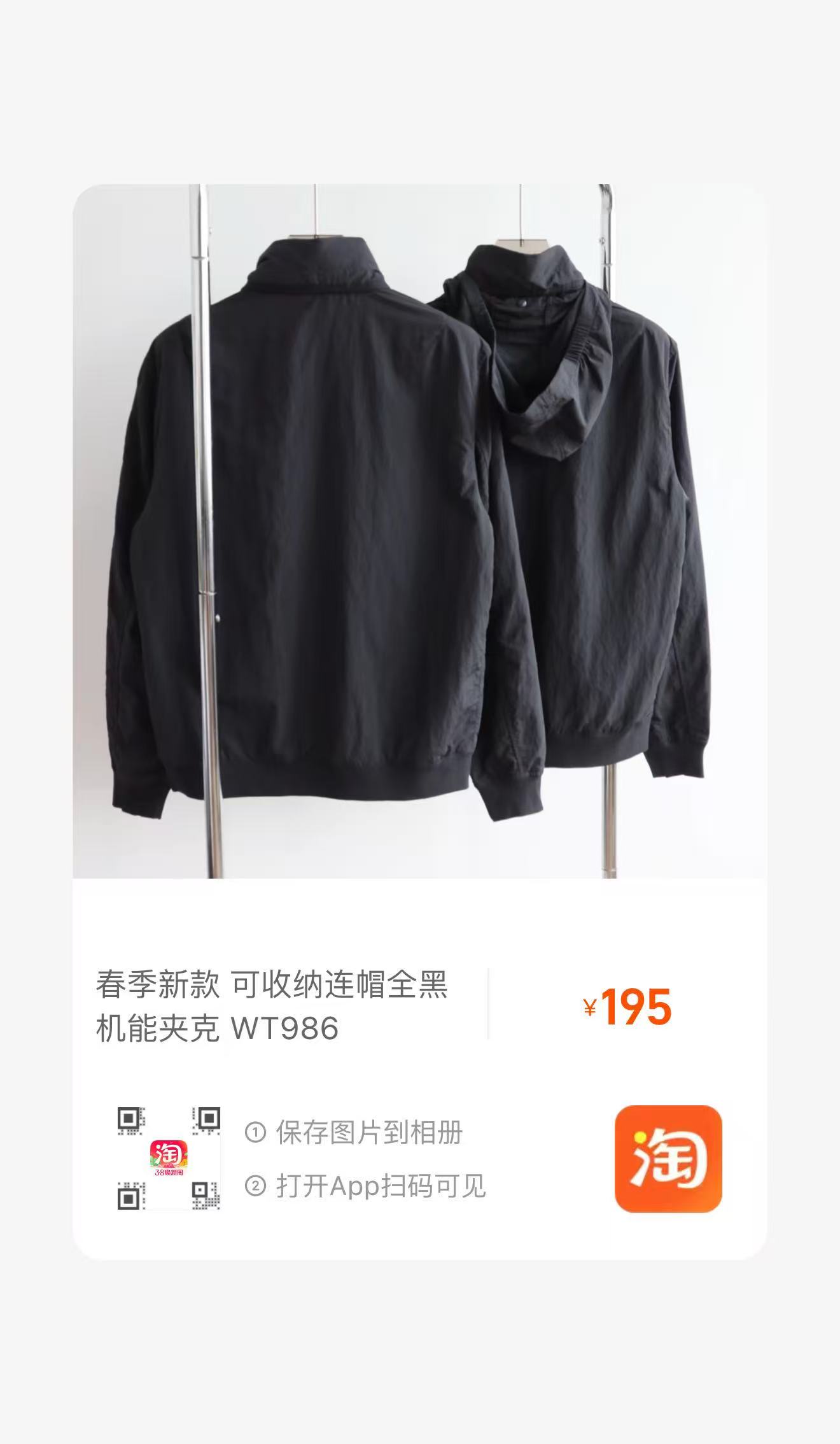 H.B 春季新款 可收纳连帽全黑机能夹克