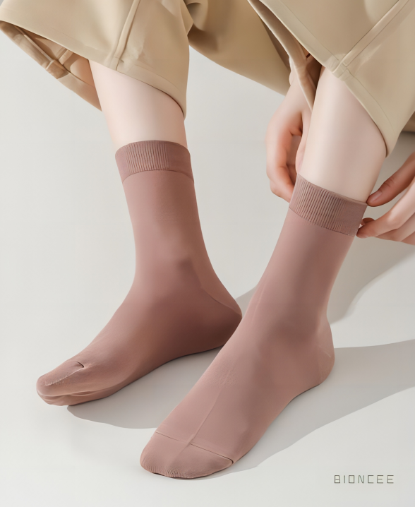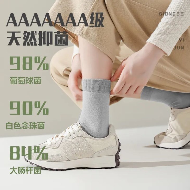 特别是到了秋冬天。一双劣质不保暖的袜子非常容易诱发。皲裂、脱皮、裂口、冻伤众多脚部疾病~众所周知,脚气是由细菌和真菌感染而得的一种皮肤病。脚气是一种传染性很强的皮肤病,你得了脚气,如果别人穿了你穿过的拖鞋,袜子,甚至是你可能只是不小心踩了别人一下都可能会让对方也得上脚气。BIONCEE-7A级别抑菌,消臭性能,洗涤150次反复测试证明,抗菌均达到98%,持久有效护理脚部肌肤。单只袜子就有上100万个孔隙,可以瞬间吸收自身重量20倍的水分!即使是大汗脚,汗液也被“嗖嗖”地吸掉,不会有黏黏的感觉。7A级-抑菌,真正的抑菌是不管你怎么洗,还是会永久抑菌。袜子本身没有抑菌性,市场上很多3A级抑菌,BIONCEE云感抗菌袜采用了物理抑菌,能够达到7A级的抑菌效果。而普梳棉成本低廉,更注重批量、快速生产,某宝常见的二三十元十双的就是用的这类棉。精梳棉不仅平整光滑,还具有强韧耐磨性,透气吸湿性和不起球、不褪色、不易变形等特点。精梳棉通俗来说就是就是一种去除棉中杂质,留下的精品棉的棉纱工艺。相较于普梳棉,精梳棉讲究精工细作,所以成本较高,一般用于高档棉织物的制作面料。阿克苏自然条件优越,水量充沛,全年日照可达3000小时以上,特别适合棉花生长,所以阿克苏又被称为“中国棉都”。这里产的棉花的品质从色度、马克隆值、纤维长度等参数均可以和世界上埃及棉相媲美。制造出平滑的纱线,让棉花更有韧性,不易起毛球,棉花的品质也就更加稳定。懂行的人都知道袜子工艺中的针数会直接影响穿着体验。一线品牌浪莎、梦娜也集中在168针和200针......好比跑圈,一个人是200米一圈,一个人是108米一圈,其他条件不变,一天下来圈数就会差很多。200针做袜子慢,产量低,所以贵。BIONCEE-7A金银花精油抑菌袜,每一双都是采用的200针纱线织造,细腻紧密,脚踩在平地上的感觉比打赤脚还舒服。3D立体编织:轻柔贴合足部,高弹亲肤无感,脚趾都能伸懒腰,对于纯棉面料,精梳的——摸上去:手感光滑,紧实不松散。看上去:紧密细致纹理特别清晰,没有跳纱、节点、线头。这款袜子用到了独家黑科技,混纺而成的抗起球科技棉纱,耐磨耐穿不会起球(可以拿刷子使劲用力去刷)。使用高回弹橡筋,每根橡筋都经过10000次弹力测试,跟脚舒适,洗多少次也不用担心袜筒松松垮垮的情况。比市面常见的袜子耐穿数倍,让袜子脱离消耗品这个标签,真正做到了好穿还耐穿!