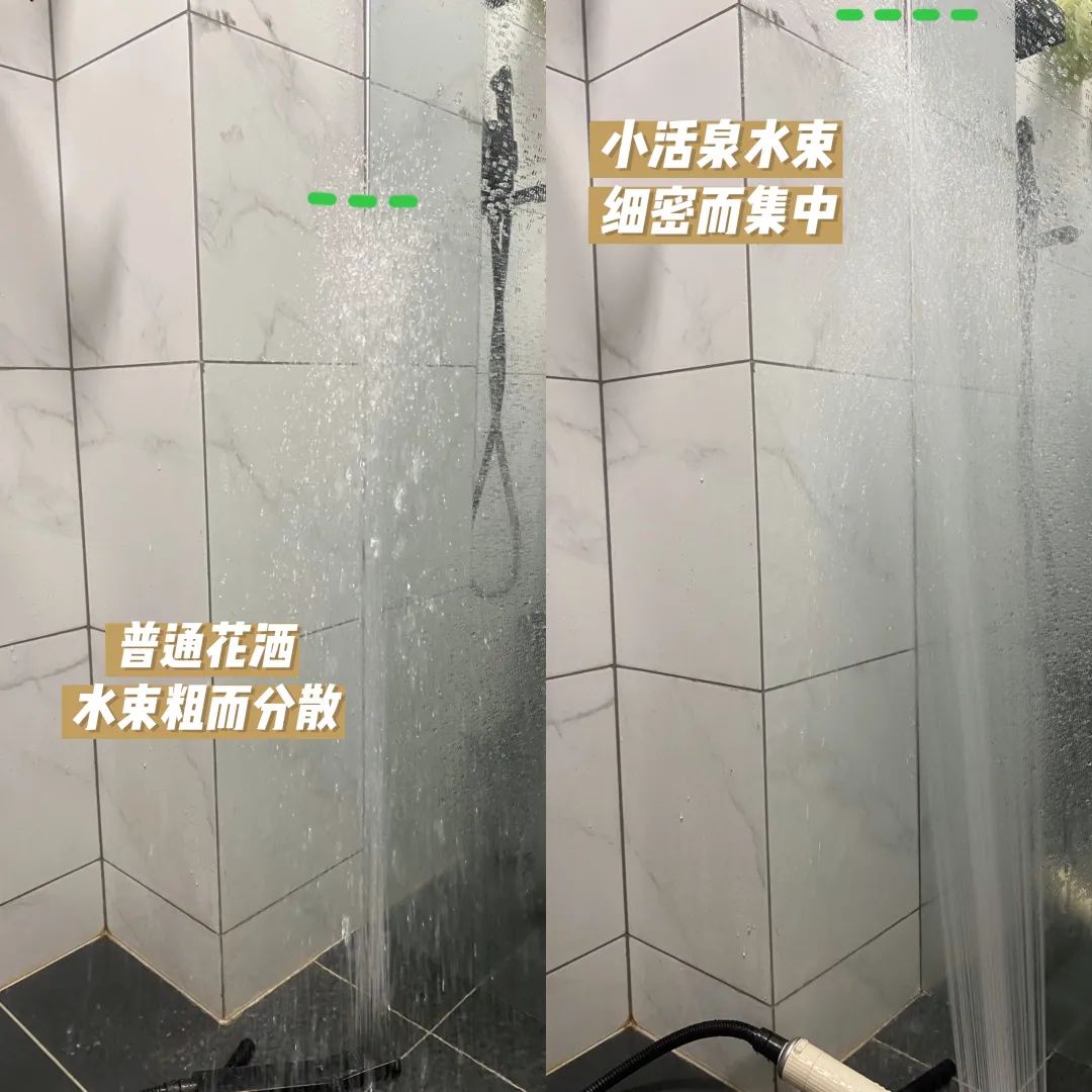 来一张普通花洒跟同事33家换了的小活泉二代对比,两个花洒水柱大小差得可不止一点点。