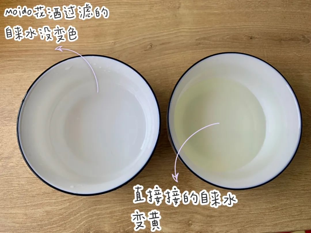 它家随花洒头会送一个余氯测试剂,好白之前测试过她家自来水,没过滤的自来水直接变黄,小活泉过滤后的水就完全无色清澈~