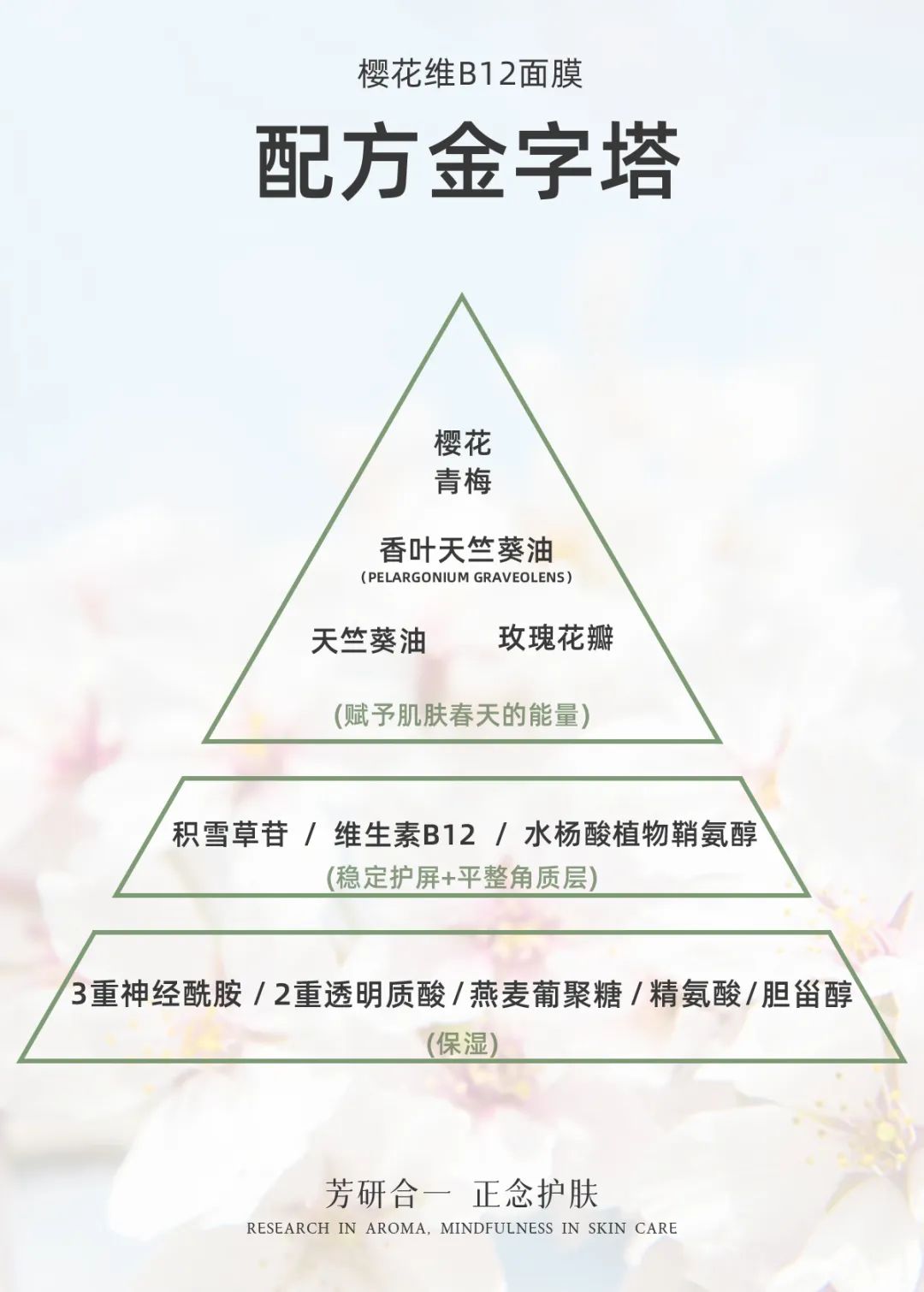 这款产品是芳家宝贝里少有的“先表达感情、再确定功效”的产品,因此这个配方金字塔也是先有上层(樱花和天竺葵),后有中层(维B12),最后有下层(保湿成分)。