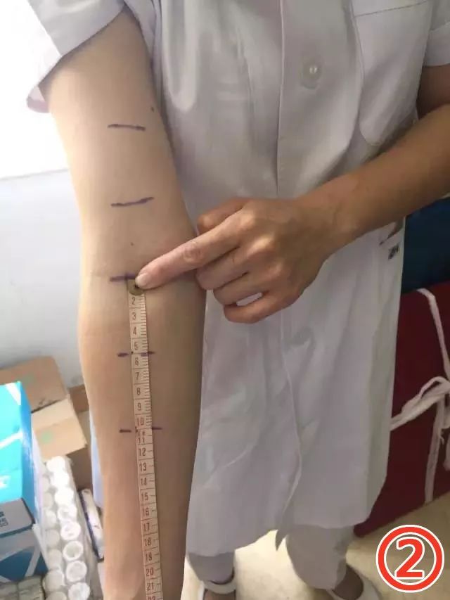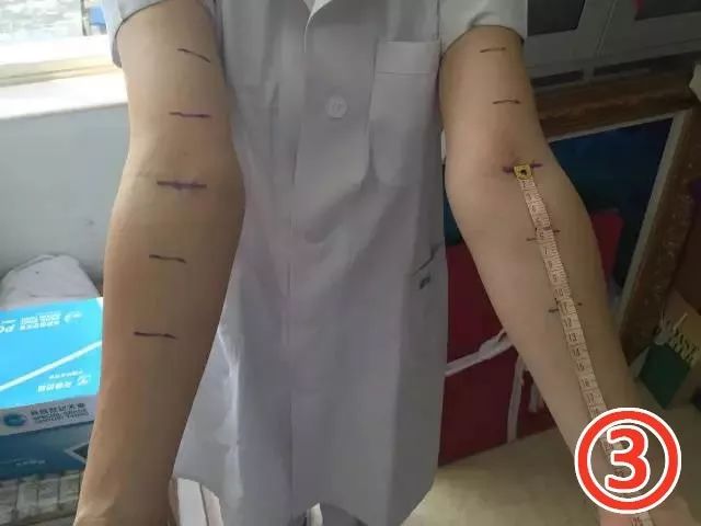 以此线为中点,向上臂及前臂5cm、10cm处各画一横线,以此4条线(肘上5cm、肘上10cm、肘下5cm、肘下10cm)作为测量臂围的固定位置。