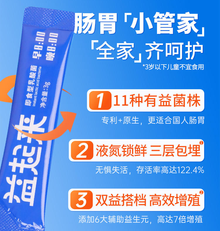 数量足、高活性,保证摄入的有效性; 专利菌株、定植力强,能直接到达肠道; 益生元增效,益生元是益生菌的口粮,保障益生菌在肠道中生龙活虎。
