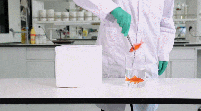 ↑取一个鲜活金鱼放入-196℃的液氮中;