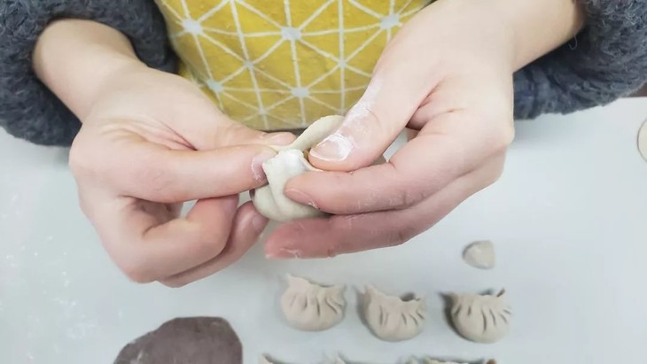 3、自行调制喜欢的馅料,面团分剂子,每个约10g,擀面杖擀制面皮,直径约10cm