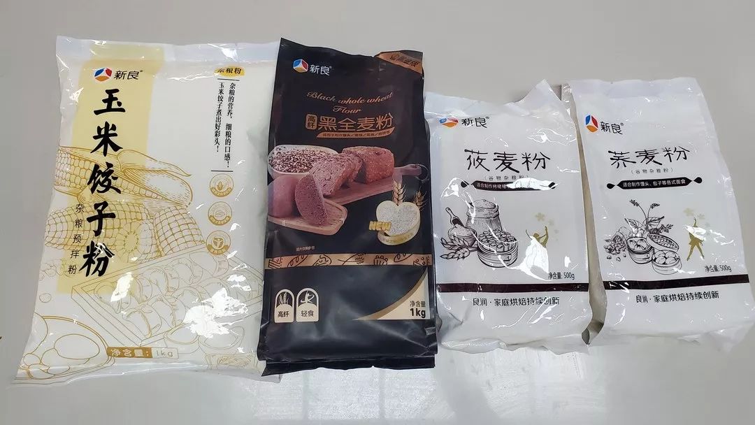 新良玉米饺子粉 100g 、新良黑金版黑全麦粉 100g 、新良莜麦粉 50g 、新良荞麦粉 50 g、新良中式面粉 100g、水62g *4、盐 1g *4、馅料 适量