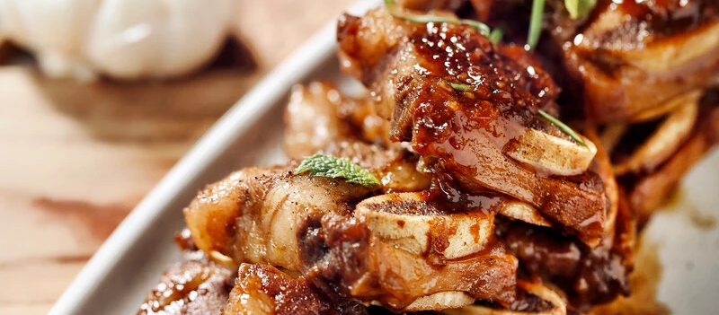 2 将完全解冻的牛仔骨用厨房纸擦干表面,沿肋骨间隙分切成3段,放入果蔬酱的容器中,充分搅拌,腌制2小时。