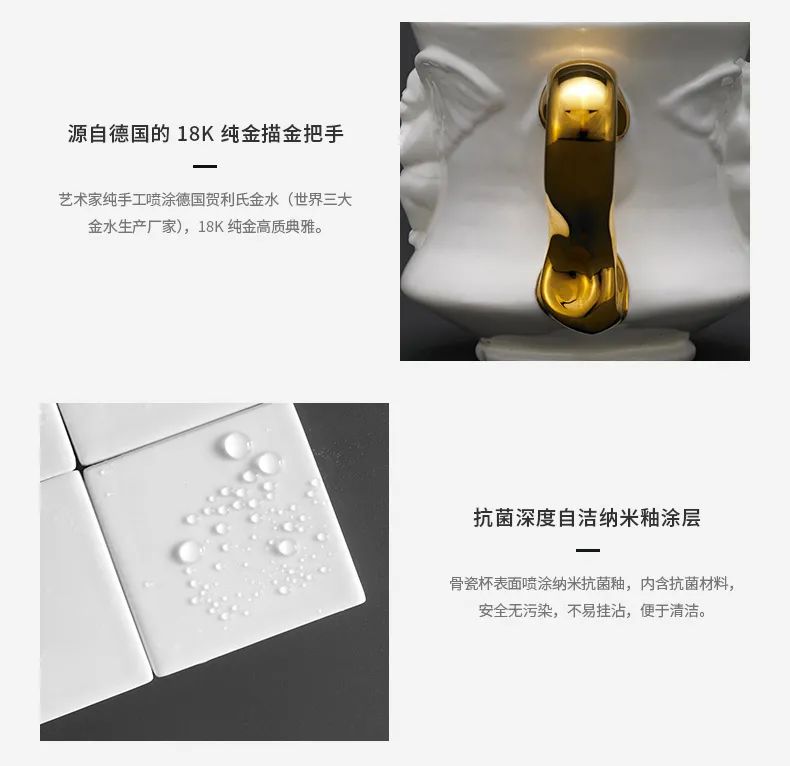 镀金天使骨瓷杯使用45%以上骨粉,德国贺利氏金水镀金手柄,精心手工制成。它也同样不平滑,代表人生“一辈子”。