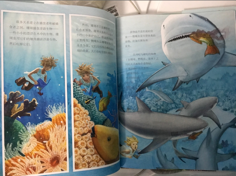 绘本还介绍了现在珊瑚礁面临着威胁,很大一部分原因是由于人类的生产和生活,给它们带来的影响。