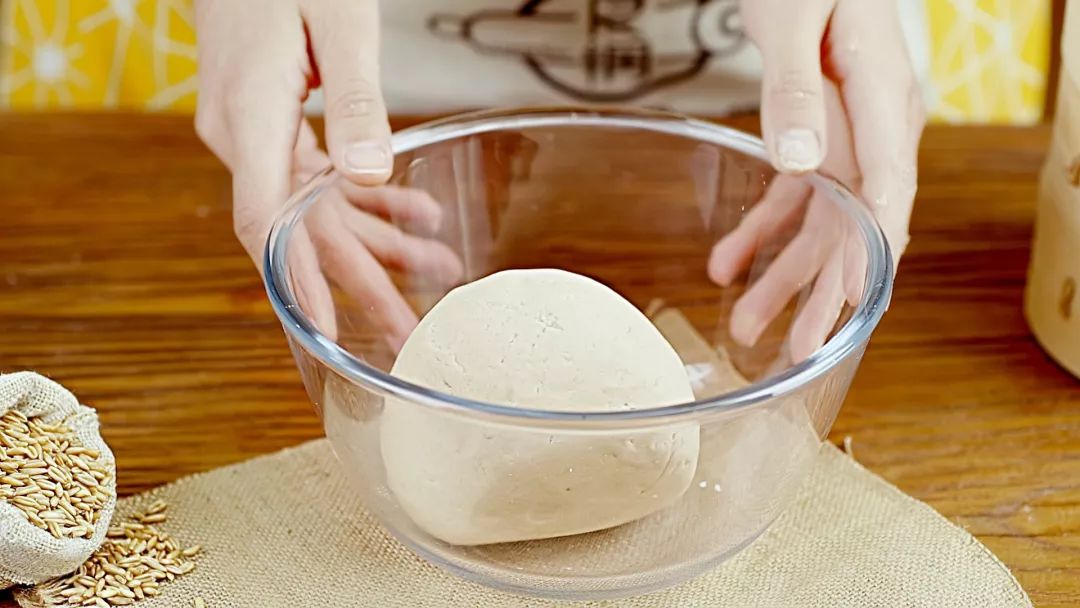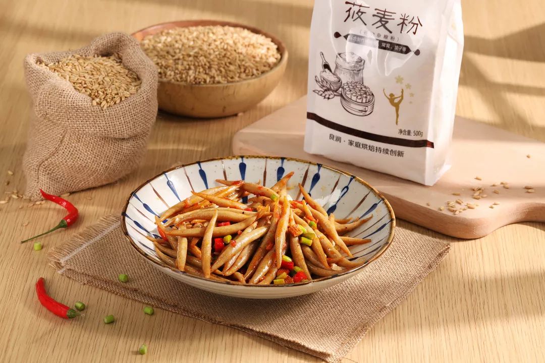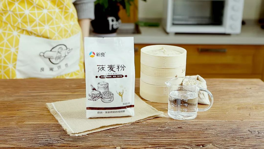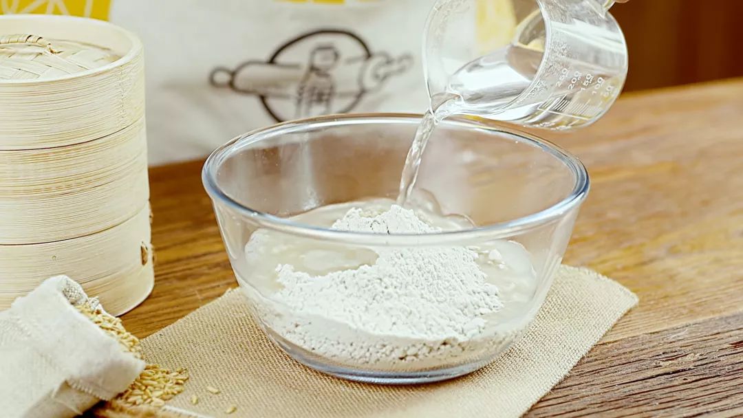 1、准备食材,先将莜麦粉倒入容器里面,加入沸水
