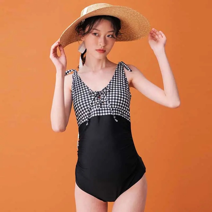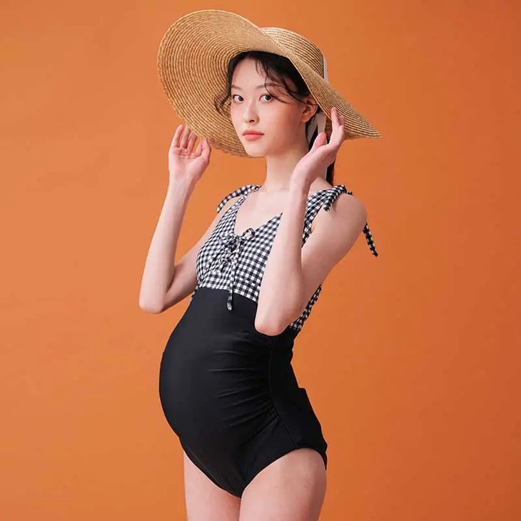 黑色永远是最显瘦的,这款泳衣的弹性非常的好,面料也很柔软,胸部的支撑、臀部包裹性都很不错。穿起来很舒服,肚子完全没有压迫的感觉。黑格子的设计很经典,而且也有很好的隐藏肚子的效果。是很多孕妈妈的选择。