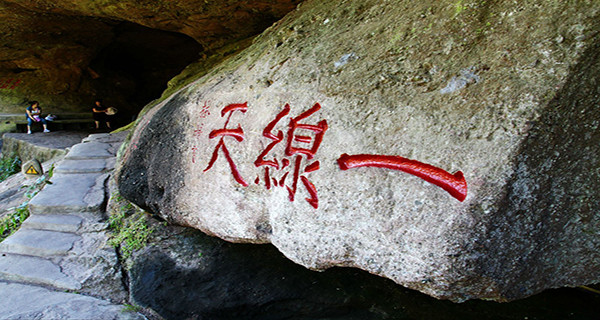 在武夷山群峰南端、二曲溪南面的一个幽邃的峡谷里,有一段绵长的山岩叫灵岩,其下覆盖了 3 个相邻的岩洞:左边的是伏羲洞,中间的是风洞,右边的是灵洞。三洞之上有一条微微向内弯曲似手写体"一"字形的岩罅,全国少见的井谷奇观一线天即为此,岩罅长 178米,最宽处才 1 米左右,最窄处仅 50 厘米,起自灵岩左端伏羲洞的洞顶,中经风洞的洞顶,止于灵洞右端灵岩后壁之外。