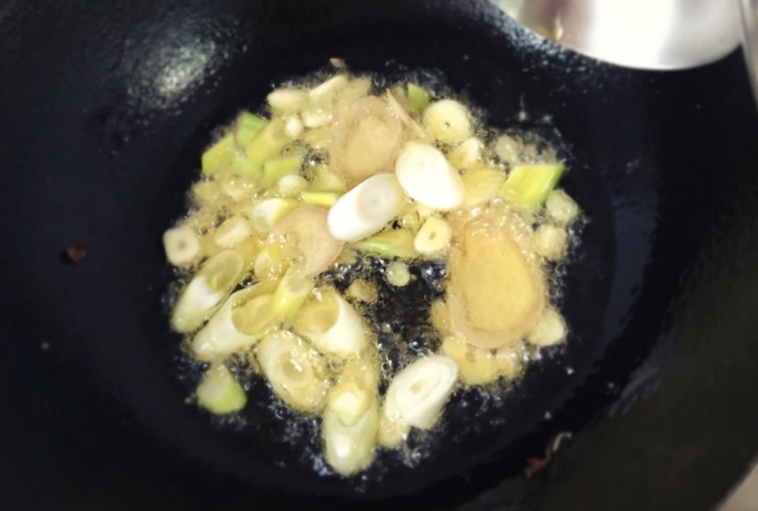 1、热锅凉油,两片五花肉炒香,再放入葱、姜、蒜煸炒,香气混合后,放入胡萝卜片煸炒几下;
