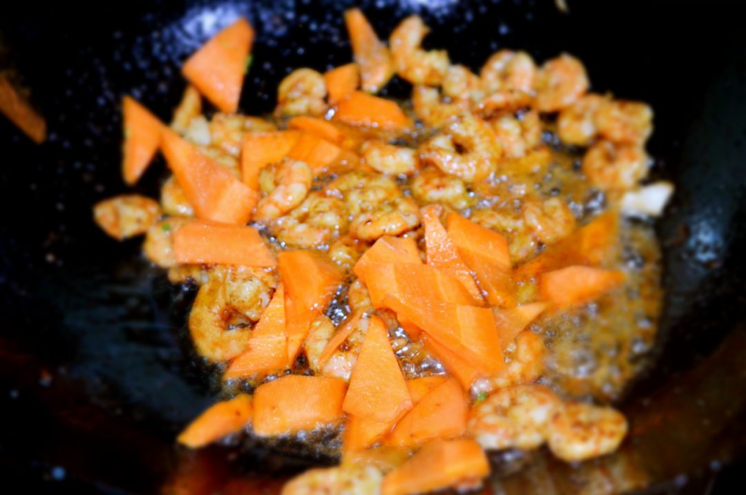 2、放入泡好的干虾仁,翻炒均匀,倒入1勺料酒,2小碗水(开水凉水均可)以及之前泡虾仁的1小碗水;