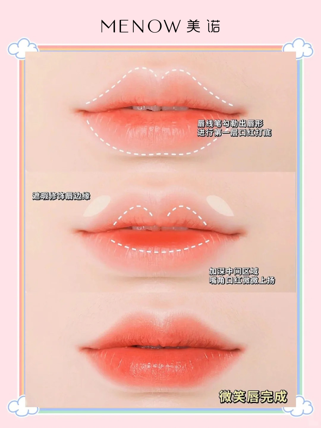 • 唇峰画V,下唇画C,嘴角勾勒上扬弧度