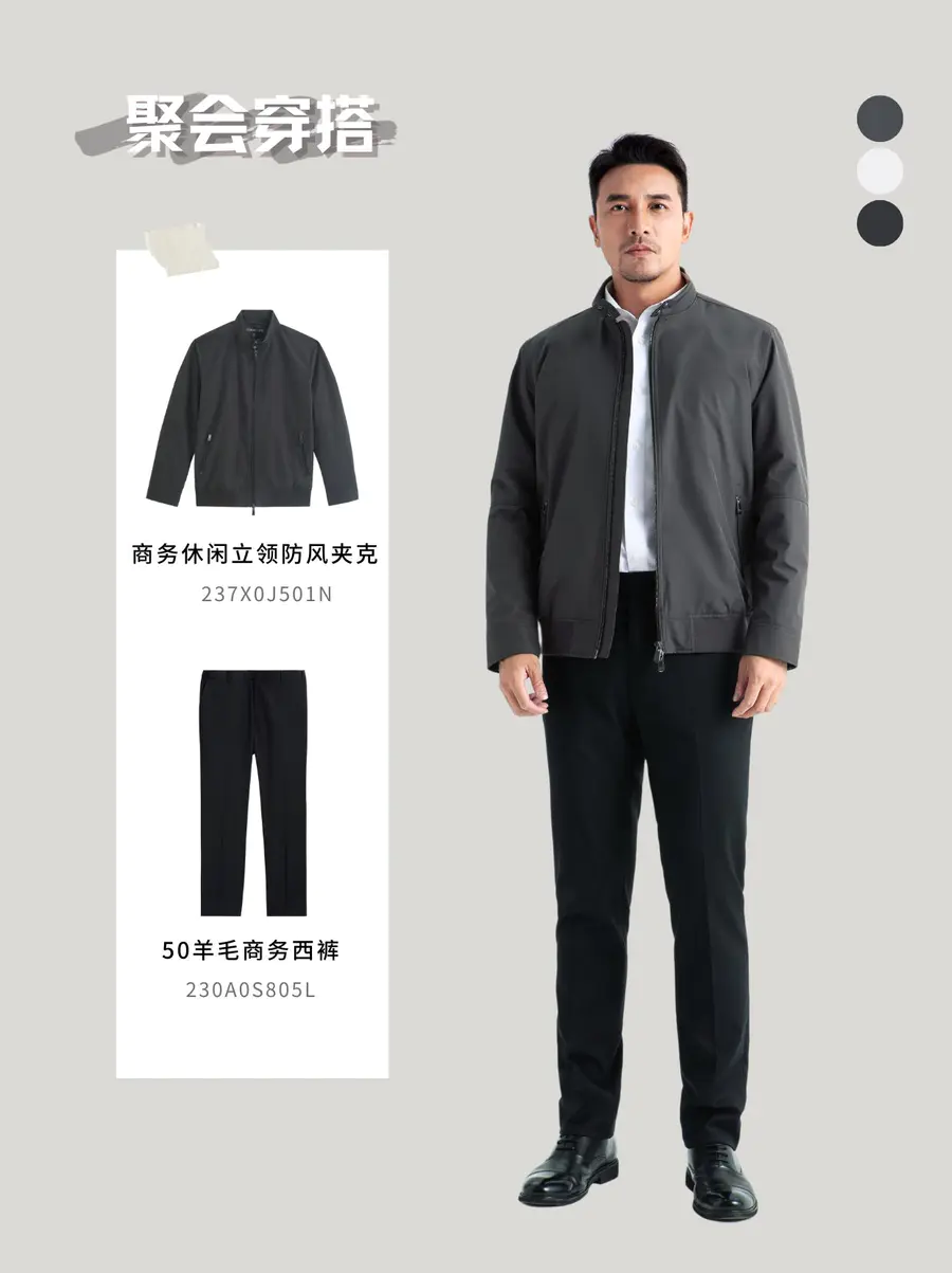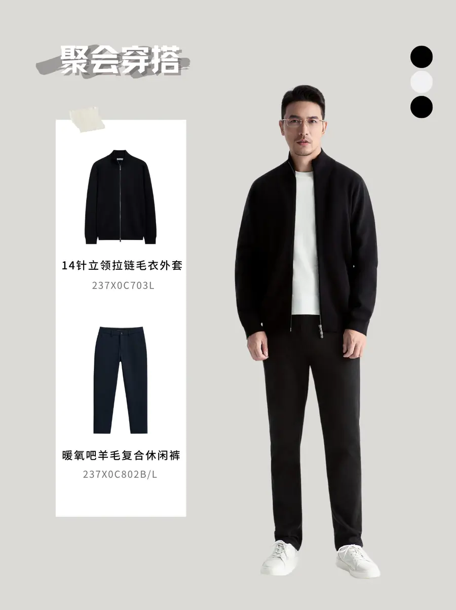毛衣外套+休闲裤是非常经典的叠穿搭配方式,