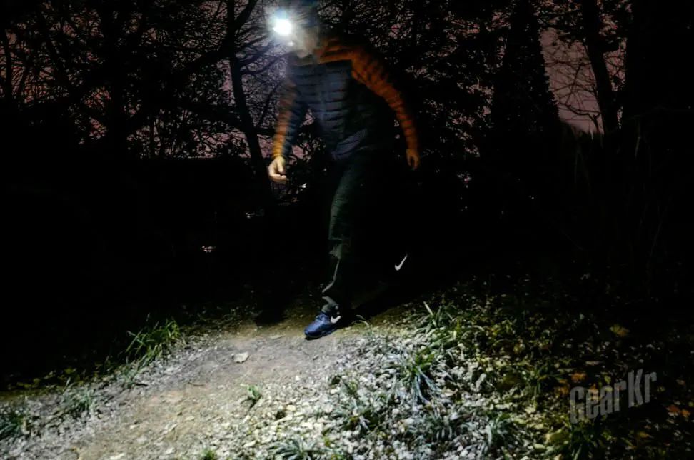90°的可调节范围在使用非常方便,比如下坡跑动时,为了保证看清脚下,可以将头灯掰到90°开启泛光,这样也不用故意低头,脚下至前方5米以内都能看得非常清楚。
