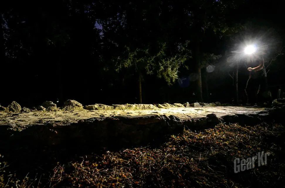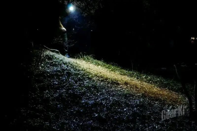 泛光光源可以在脚下带来大面积的照明,跑步的时候,十几米以内都能看得清清楚楚,而且左右两侧的路况也能清晰呈现,色彩的还原性也不错,视物立体感较强,有利于应对户外复杂地形。