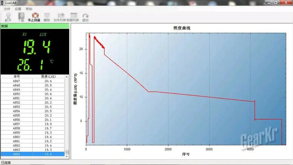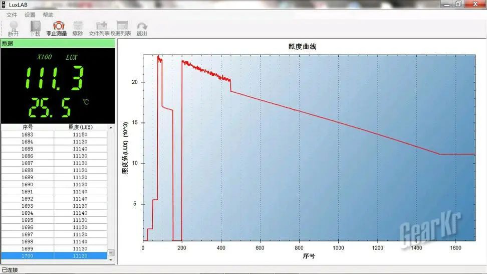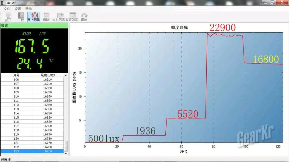 五个档位对应的50厘米距离照度如下图所示,同光源对应的比例大致相等,开启双灯后,由于并不是两盏灯最高亮度的叠加,照度有所下降,这是聚光灯降低了输出所致。