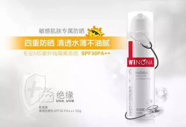 薇诺娜清透防晒乳:清透水薄,含有独特的MS专利紫外线隔离系统,能有效阻隔UVA和UVB;内含马齿苋成分能增强肌肤的耐受性,降低敏感度。