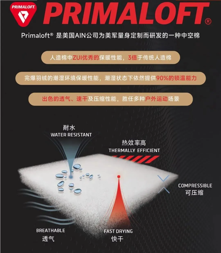 P棉全称PRIMALOFT棉,分为金标、银标、黑标3类,而金标P棉堪称蕞优!相比羽绒它升温快、锁温强、防潮透气,号称户外保暖界的“珠穆朗玛”!