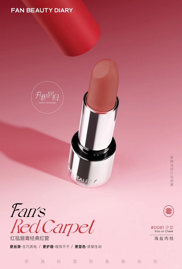 敢爱敢恨,纯真赤忱💖,是范小姐所演绎的少女本色。全新#FanBeauty红毯唇膏💄#0081少女 Kiss on cheek 正式升级回归!温柔的海盐肉桂色,如少女率性而为的轻柔一吻,却在心里掀起阵阵涟漪。