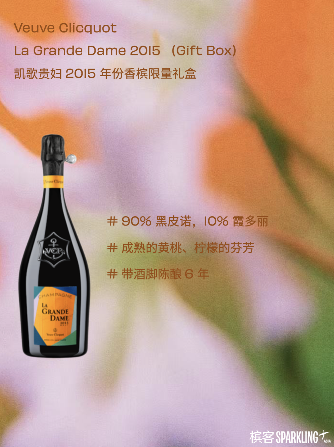 1805 年,27 岁的凯歌夫人继承丈夫遗志,接手整座酒庄,成为香槟史上的首位女庄主。她创造了转瓶架,改革了香槟的除渣工艺,更在 19 世纪初以惊人的魄力与商业远见,将香槟推向世界。“贵妇”(La Grande Dame),便是对她不朽精神与卓绝成就的最高致敬。2015 年是香槟区的杰出年份,赋予了它无与伦比的深邃与陈年潜力。
