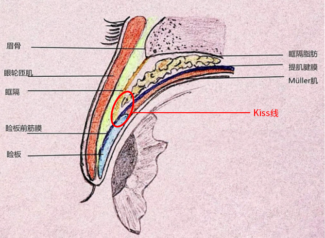 将重睑线定点定位在,相对更柔软有弹性的kiss线上,Kiss线是睁眼运动时的“最佳发力点”,因此双眼皮成型不显假,更有灵动性。这也是当代“改良版kiss法”。