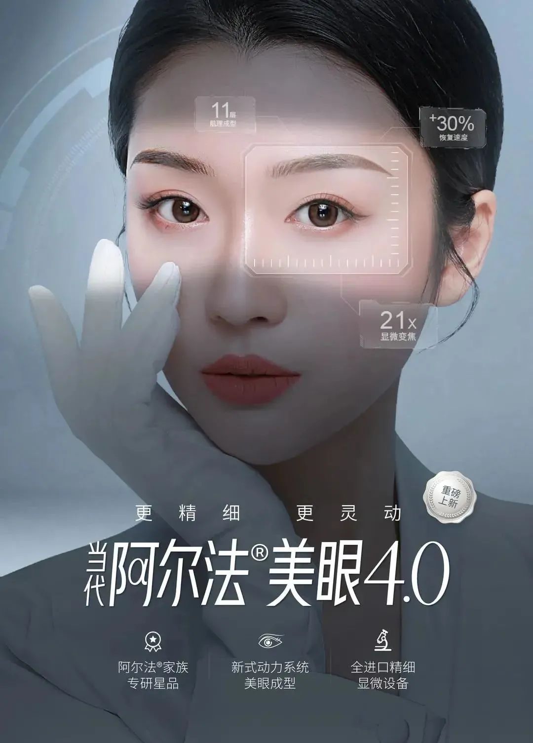 阿尔法®美眼4.0的技术创新和突破在于,睑缘切口隐痕、新式动力系统软悬挂术、显微眼技术等多重技术的联合运用。