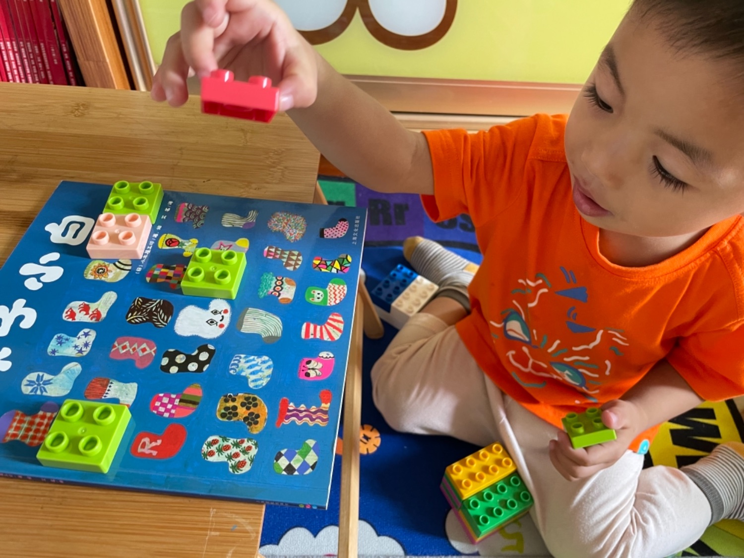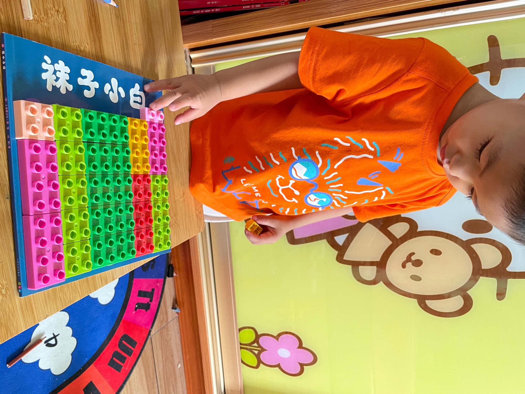 然后,我们一起摆更多积木在封面,摆了好几次,每次摆完,他又超兴奋全弄开,指出袜子小白给我看!