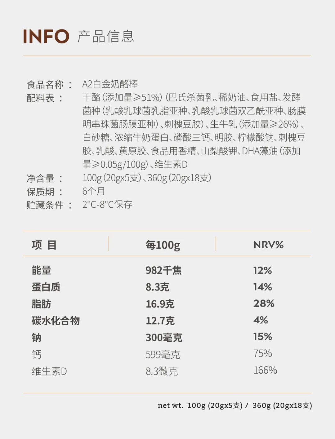 正是有这样的加持,使得每100g的A2白金奶酪棒: